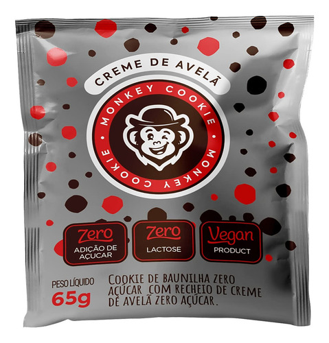 O Cookie de Creme de Avelã Zero Açúcar 65 g da Grand Monkey é um snack em tamanho individual, com massa de cookie e recheio cremoso de avelã, formulado na versão “zero açúcar”, ideal para quem busca indulgência com menos adição de açúcares.