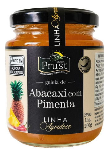 A Geleia Agridoce de Abacaxi com Pimenta 260g da Prust Alimentos é um doce gourmet que combina a doçura natural do abacaxi com o sabor marcante e levemente picante da pimenta vermelha. Conforme a ficha do produto: “Abacaxi, pimenta, água e suco de limão”.