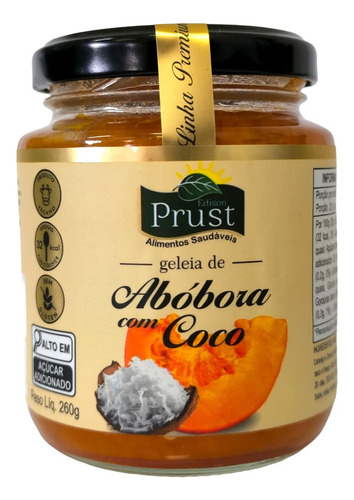 A Geleia de Abóbora com Coco 260g da Prust Alimentos é um doce artesanal em pote, feito com polpa de abóbora combinada ao coco ralado, resultando em uma textura cremosa e sabor delicado que une o doce natural da abóbora ao toque tropical do coco. Segundo cadastro oficial, uma versão com essa combinação está registrada como “Geleia de Abóbora com Coco”.