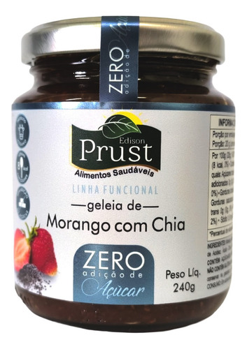 A Geleia de Morango com Chia Zero Açúcar 240 g da Prust Alimentos é uma geleia funcional feita com morangos selecionados e sementes de chia, formulada sem adição de açúcares, ideal para quem busca sabor de fruta combinado a praticidade e controle de açúcar.