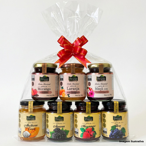 O Kit Natal Degustação de Geleias 260g é uma combinação pensada para presentear e montar momentos de degustação, trazendo embalagem transparente de presente e laço. Reúne 7 sabores da Prust em potes de vidro de 260g, pensado para presentear e montar uma mesa de degustação com combinações clássicas e sabores mais “gourmet”. As geleias são versáteis para pães, torradas, biscoitos, iogurtes e sobremesas, além de harmonizarem muito bem com queijos. O kit mistura frutas tradicionais (morango, uva e amora) com versões especiais, como maçã com hibisco e canela, laranja com gengibre, morango com chia e abóbora com coco.