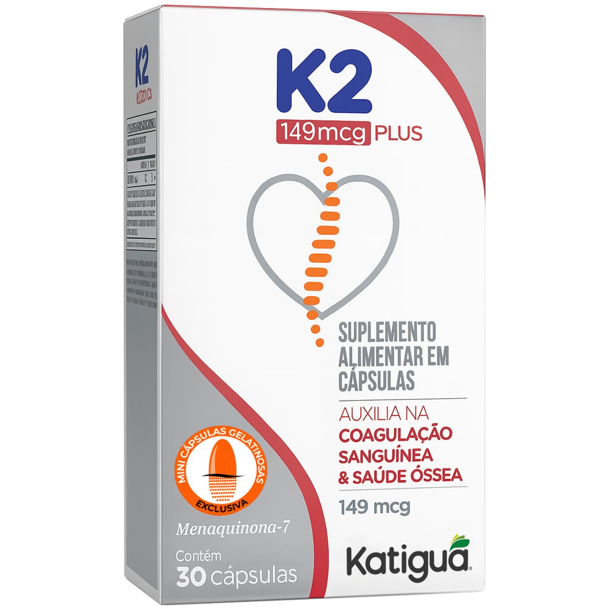 O suplemento Vitamina K2 Plus da Katiguá é um produto alimentar na forma de softgel/cápsula gelatinosa, com 30 doses por embalagem, que fornece 149 µg de vitamina K2 (menaquinona‑7) por dose.