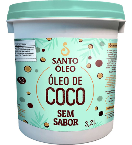 O Óleo de Coco Extravirgem Sem Sabor 3,2L - Santo Óleo é extraído por prensagem a frio da polpa do coco seco, resultando em um óleo 100% natural, sem sabor ou aroma de coco. Com acidez máxima de 0,2%, é ideal para uso culinário, permitindo que o sabor dos alimentos prevaleça, além de ser uma excelente opção para cuidados estéticos, proporcionando hidratação à pele e aos cabelos.