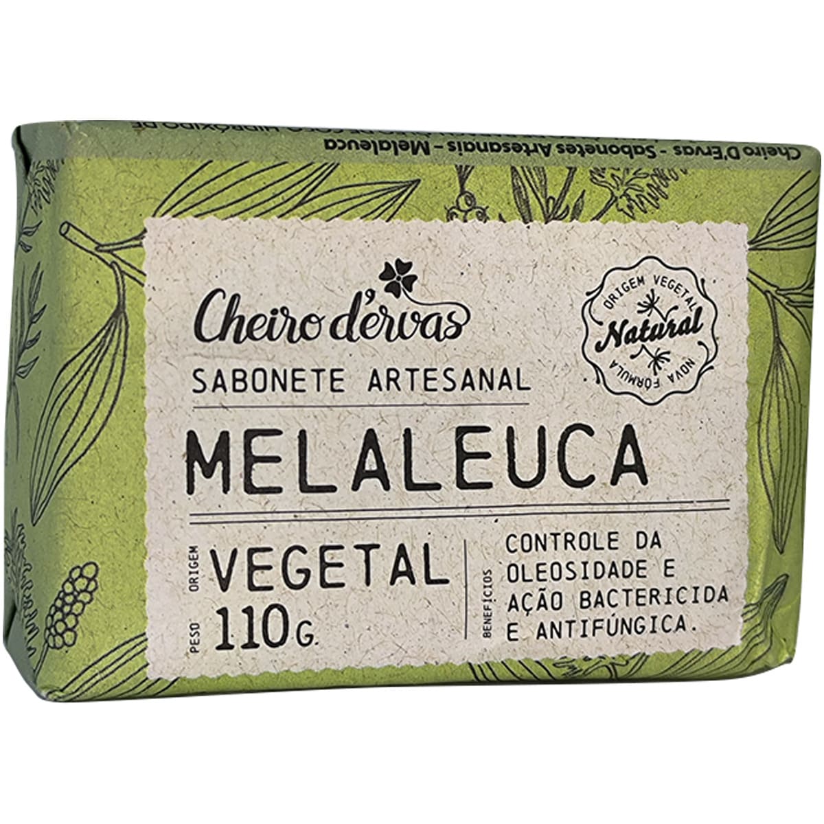 O Sabonete de Melaleuca 110g da Cheiro D'Ervas é formulado com óleo essencial de melaleuca, conhecido por suas propriedades antissépticas, antifúngicas e anti-inflamatórias. Indicado para auxiliar no tratamento de acne, micoses de unha e caspa, além de acalmar a pele após a depilação. Para uso, massageie o sabonete sobre a pele molhada até formar espuma e enxágue em seguida. O produto é vegano, orgânico e dermatologicamente testado.