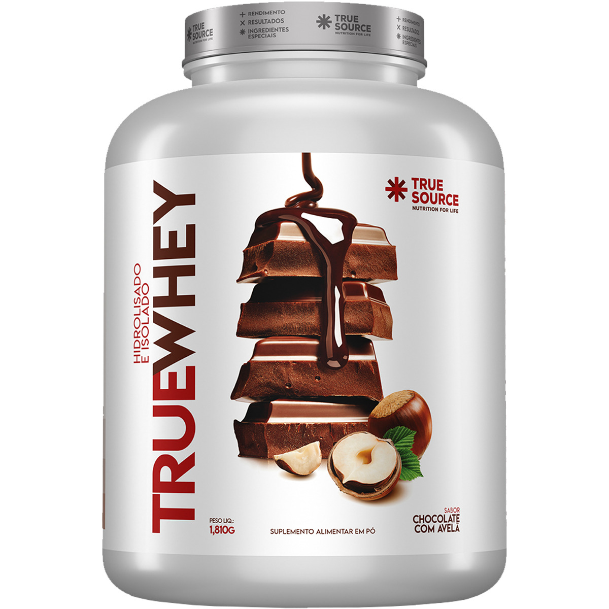 O Whey Protein Chocolate com Avelã 1810g da True Source é um suplemento proteico premium formulado com blend de whey isolado e hidrolisado, que fornece 23g de proteína e 5,3g de BCAAs por porção de 32g. Ele também contém 2,5g de colágeno Verisol®, ideal para apoiar a saúde da pele e reduzir sinais de flacidez. Adoçado naturalmente com estévia, taumatina e maltitol, é livre de glúten e corantes artificiais.
